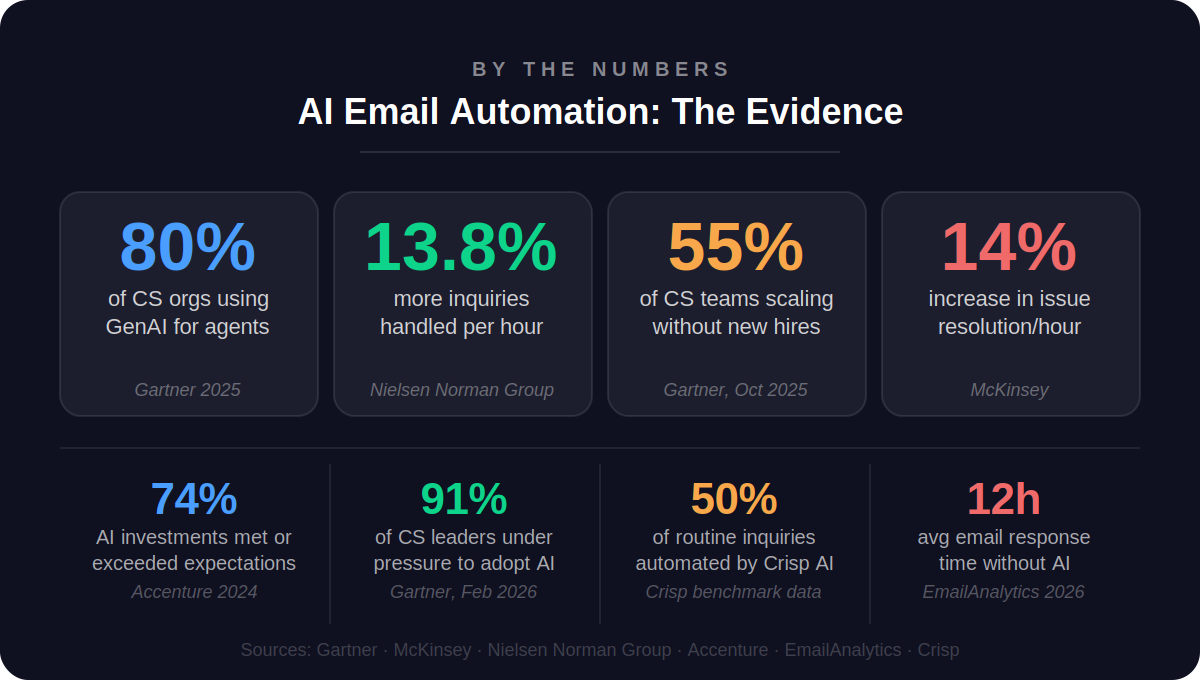The data makes this clear. Gartner's 2025 survey of 321 customer service leaders found that 55% are already handling higher volumes with the same headcount. Not reducing teams — scaling them. That's the actual story of AI email automation. Not replacement, but multiplication of efficiency.