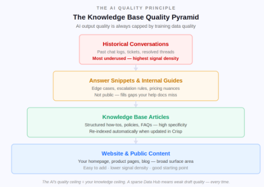 - Historical conversations: your most underused and most powerful source. Past chat logs and resolved tickets show the AI how your customers actually phrase questions and what solutions worked. Most teams skip this entirely.