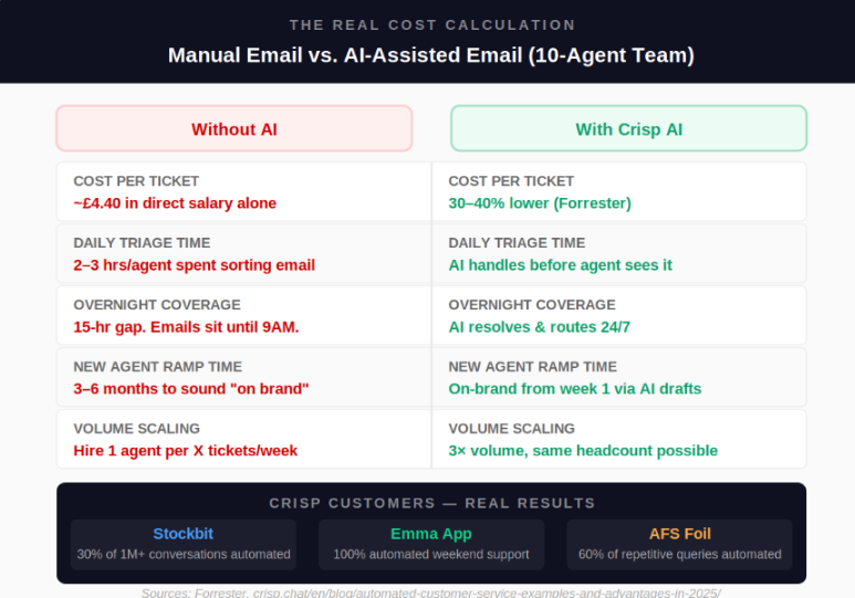 If an agent earns £35,000 per year and handles 8,000 tickets annually, each ticket costs roughly £4.40 in direct salary alone — before management overhead, training, tooling, and benefits. Industry estimates put the real loaded cost at 1.25x to 2x the base salary figure. Multiply across a ten-person team, across a full year of volume, and the number becomes the kind of line item that gets noticed in a board presentation.