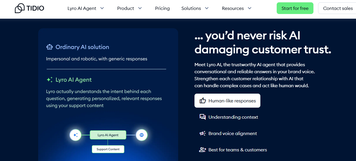 SMB-Friendly Automation: Lyro by Tidio earns high marks on G2 (4.6/5, 600+ reviews) and Capterra (4.7/5, 470+ reviews) for fast setup, strong Shopify integration, and a 67% average resolution rate. Scaling teams surface two consistent ceilings: Lyro cannot learn from historical support tickets — only from explicitly written knowledge base content — and daily conversation caps create service inconsistency during peak periods