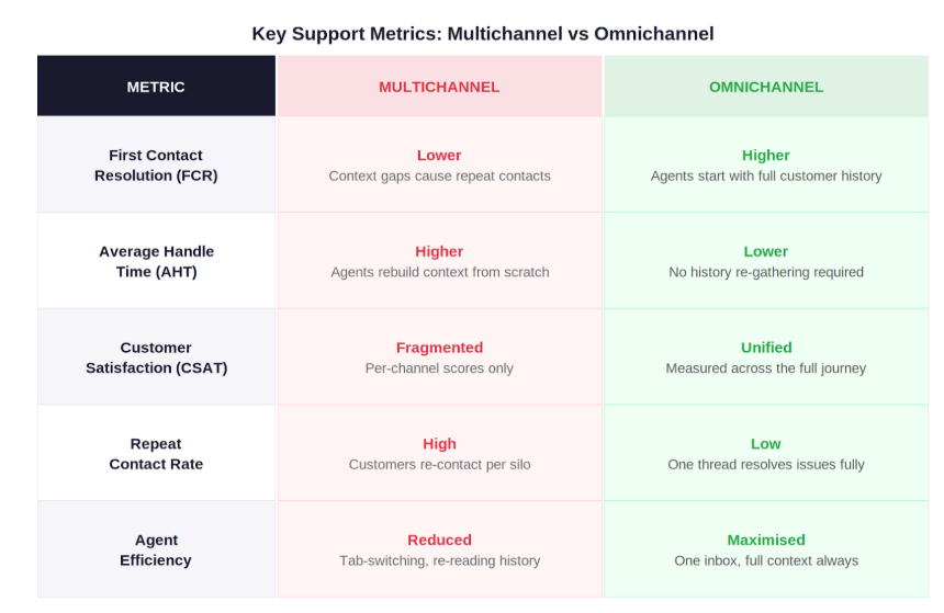 Here are the five metrics most support leaders run on, and how the choice between multichannel and omnichannel directly affects each of them.