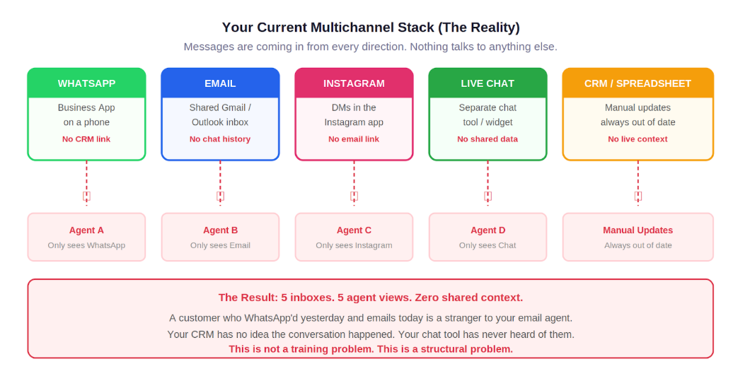 Most platforms that call themselves omnichannel are multichannel tools with a shared reporting layer bolted on top. The channels look connected on the dashboard. Open a conversation and you will quickly realise the context stops at the channel boundary. The email agent still has no idea what happened on WhatsApp.