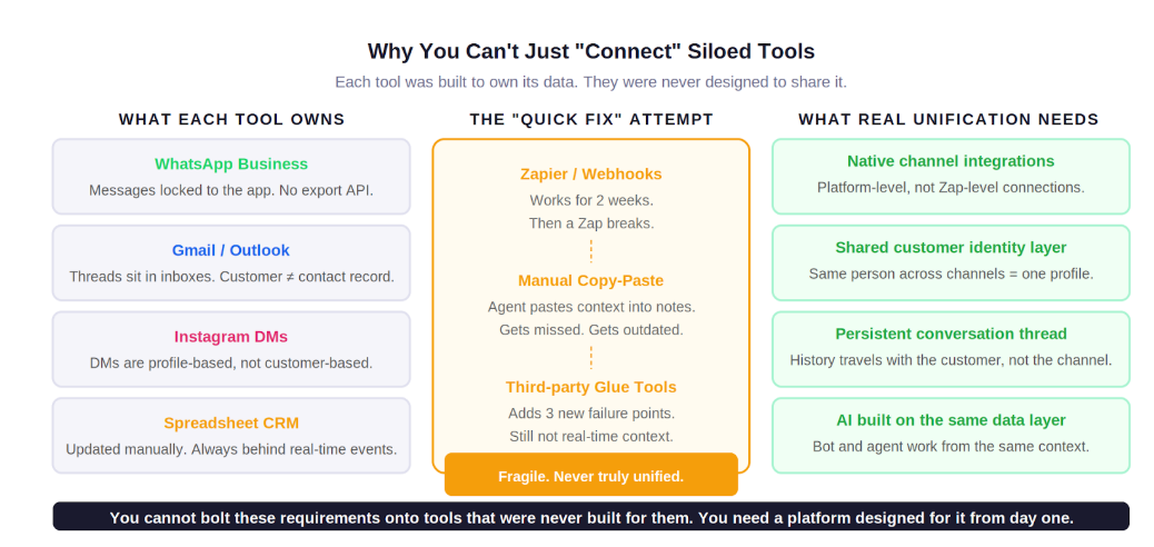 So when you try to stitch these together with Zapier or a webhook, you are not creating omnichannel support. You are creating a fragile patchwork that looks unified until it breaks. And it will break. The Zap fails. The webhook times out. Someone changes their phone number and the record goes stale. You end up with three different customer profiles for the same person across three tools, all of them incomplete.