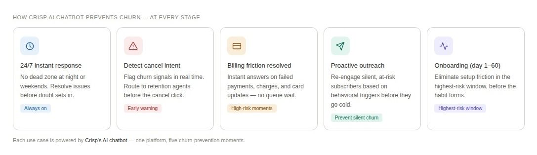 How Crisp does it: Crisp's AI chatbot provides instant, contextual onboarding support at every step — answering "how do I" questions in seconds, surfacing the right documentation automatically, and offering guided walkthroughs for common setup flows. First-contact resolution improvements reduce churn by 67% — and the highest-leverage place to deliver first-contact resolution is in the onboarding phase, when the customer is most engaged and most educable. Crisp's chatbot ensures no new subscriber falls through the cracks simply because they couldn't get a quick answer at the moment they needed it.