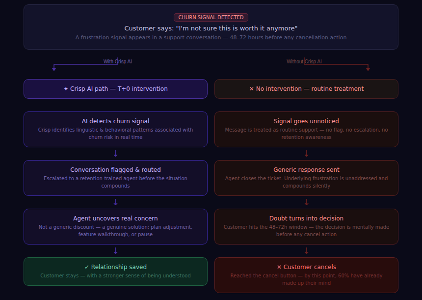 Yes — with the right configuration. Churn-intent language can be detected in real time from conversation data. Crisp's AI can flag and route these conversations before they reach the cancellation flow, giving a retention-trained agent the window to intervene.