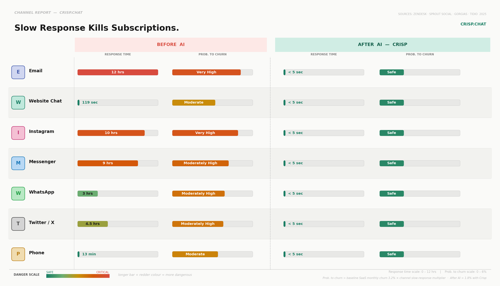 Crisp's AI chatbot is purpose-built for businesses where retention is a revenue variable. It handles multichannel inbound support 24/7, detects at-risk language in real time, routes escalations to live agents with full conversation context, and enables proactive outreach based on behavioral triggers — all from a single platform.