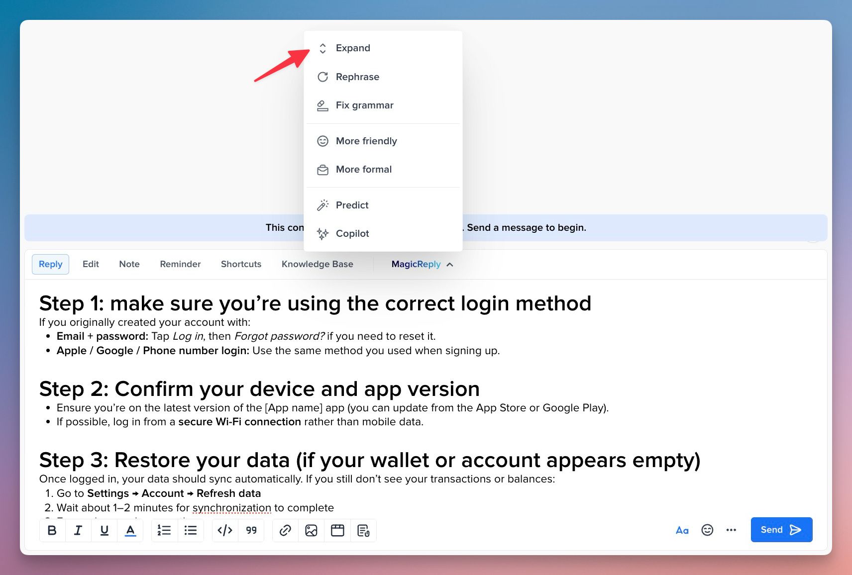 Vague answers are the number-one cause of reopens. Train your team (and your AI) to write complete, actionable messages: include next steps, links, and verification prompts.