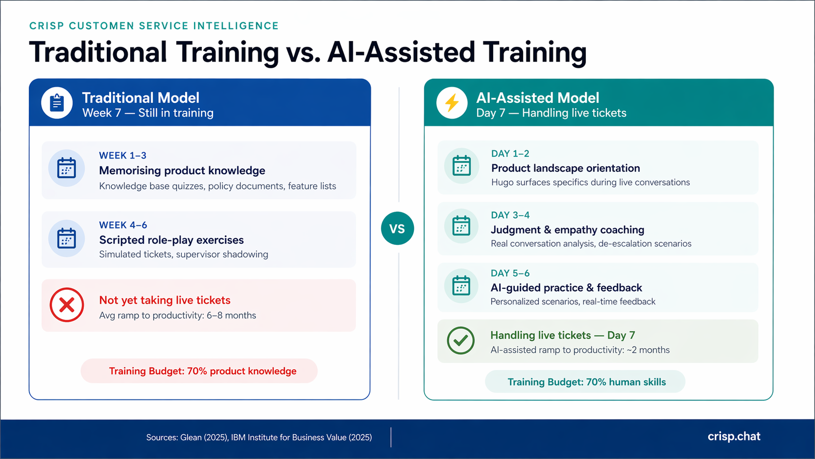 Hugo, Crisp's AI agent, removes product knowledge retrieval from the cognitive load of every agent conversation. This changes what training needs to cover โ not as an efficiency optimization, but as a curriculum design decision. When an agent doesn't have to carry the full product knowledge load during a live interaction, they have the working memory available to read the customer, calibrate their tone, and make the judgment calls that determine whether a complex interaction resolves or escalates.