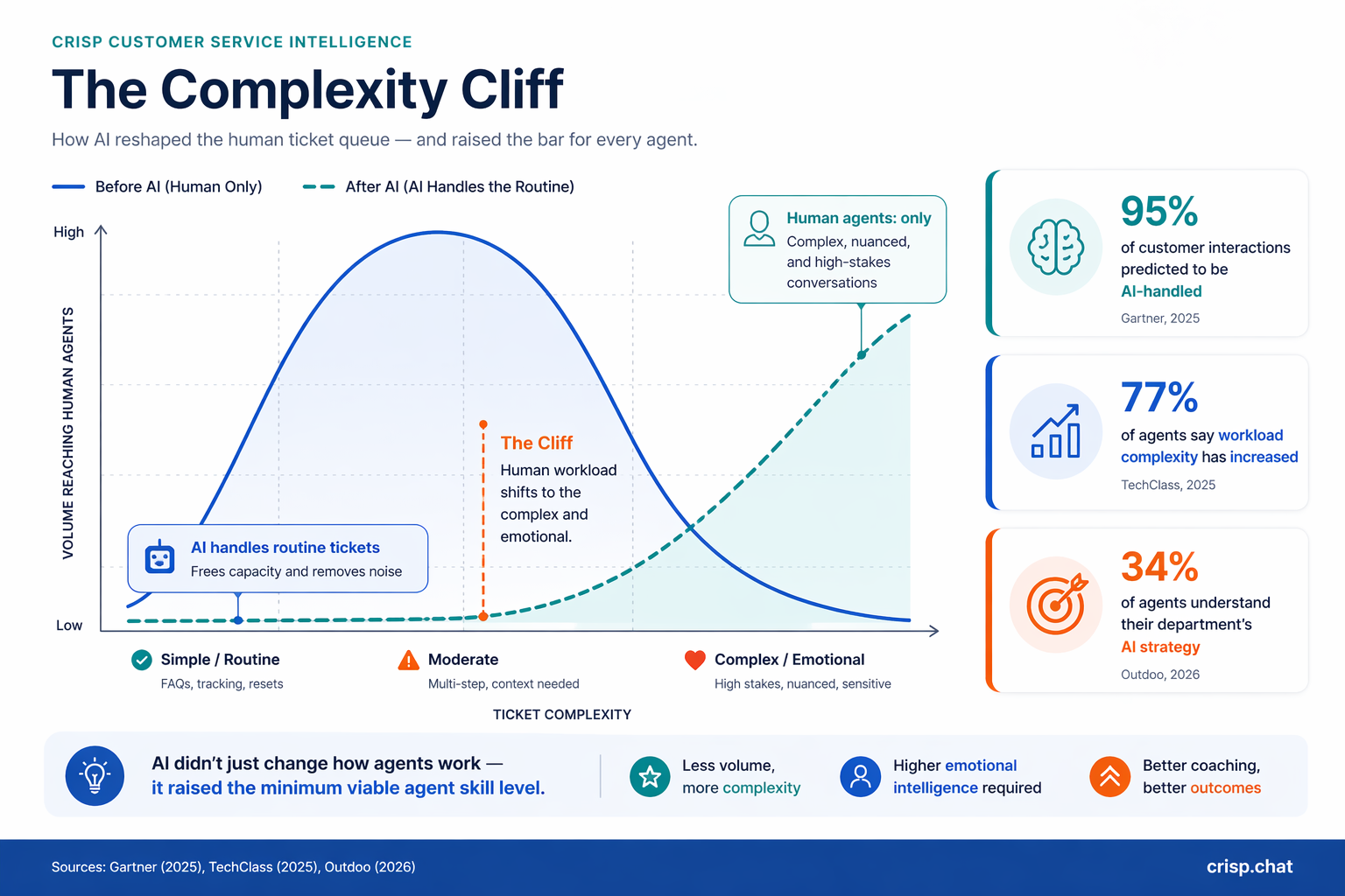At the same time, 95% of customer interactions are predicted to be handled by AI, which means the residual human interactions represent the highest-difficulty tier by definition.