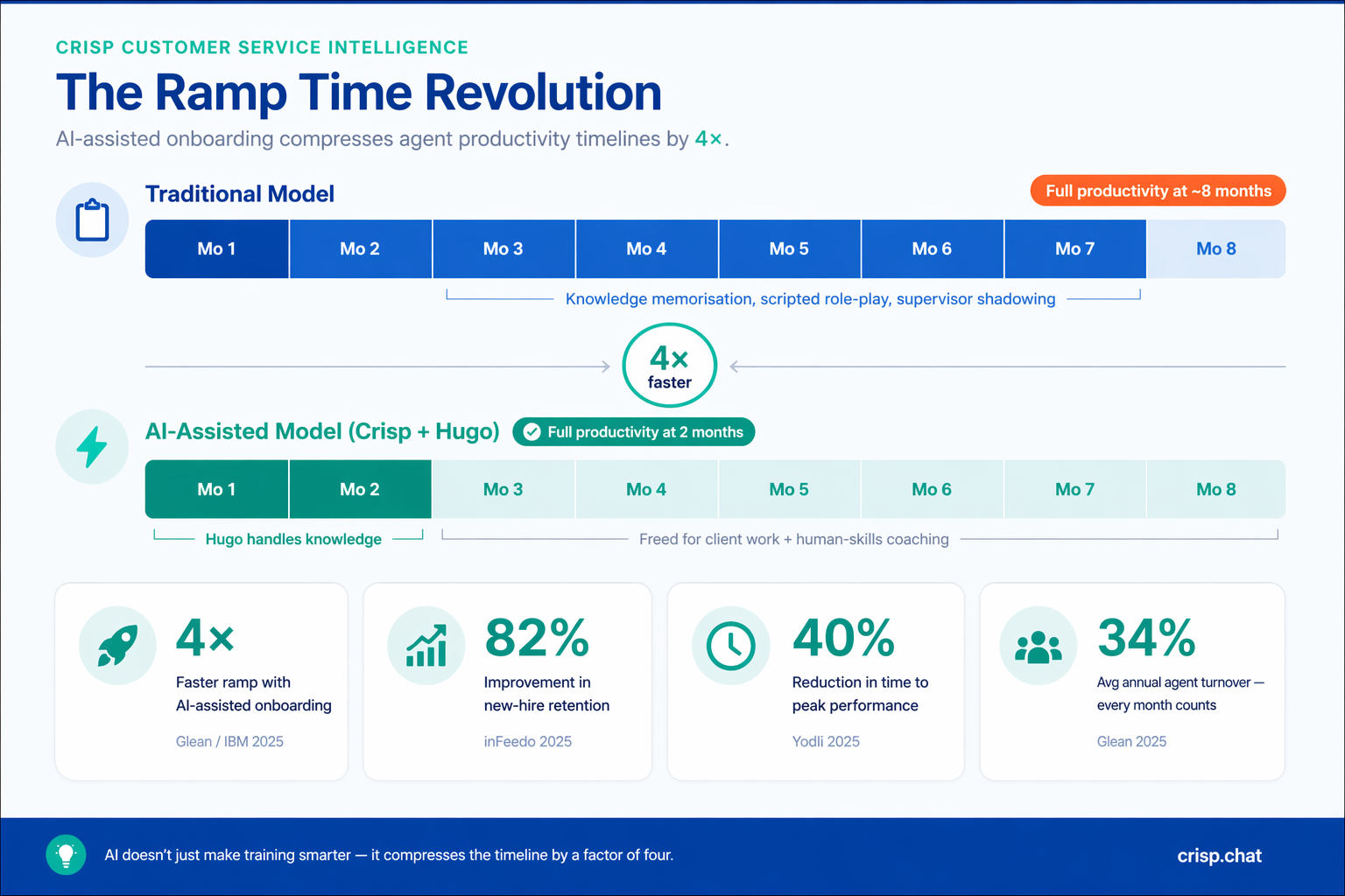 AI-accelerated onboarding has compressed the ramp-to-competence timeline from eight months to two โ a four-times improvement. IBM documented a 50% reduction in time-to-peak-productivity using AI-enhanced onboarding systems. Organizations with strong AI onboarding infrastructure report 82% improvement in new hire retention and a 40% reduction in the time agents take to reach full performance levels.