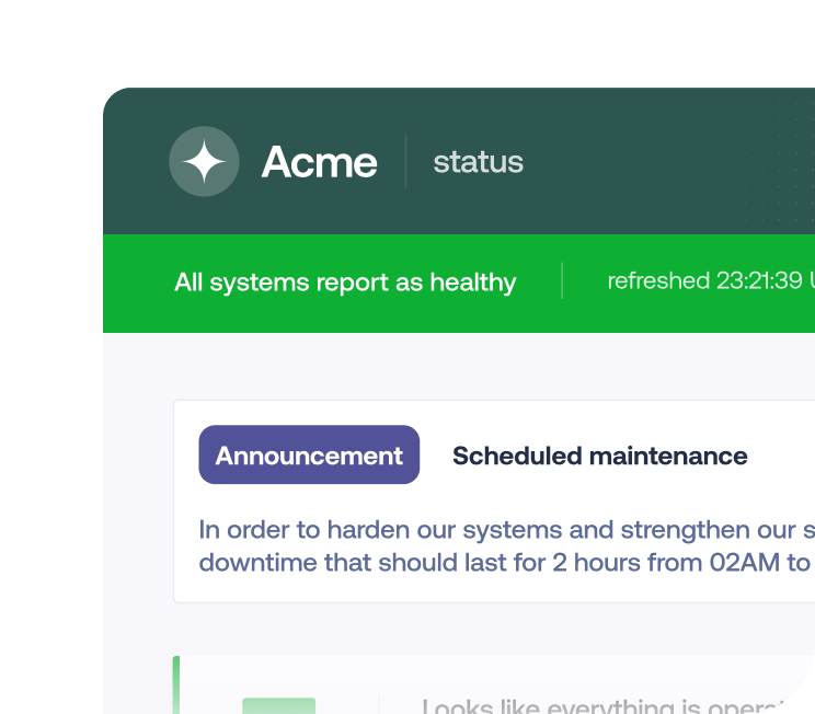 A Status page is the public part of your incident management process. Status page software help companies to provide customers with informations during an outage, helping them to stay in the loop from 'investigating' to 'resolved'. A Status page offers powerful feature that helps to monitor, alert, engage, and centralize incident operations management for efficient response every time, helping support teams and tech teams to focus on resolutions.